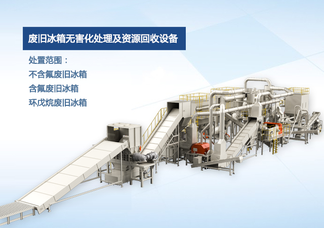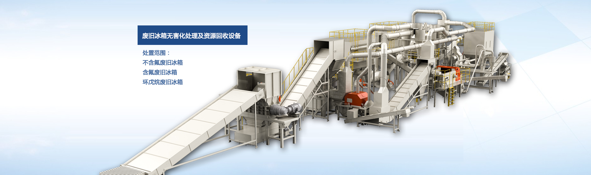公司自主研發(fā)的廢舊冰箱無害化處理及資源回收技術(shù)及設(shè)備, 獨具 “雙軸撕碎機(jī)+立式破碎機(jī)+大風(fēng)量稀釋環(huán)戊烷氣體”的專利組合設(shè)計, 主要用于對廢舊冰箱中的各種原材料進(jìn)行分離、 回收和利用, 具有自主知識產(chǎn)權(quán), 經(jīng)國家工業(yè)和信息化部科技成果鑒定為 “填補(bǔ)國內(nèi)空白, 達(dá)到國際先進(jìn)水平” 。